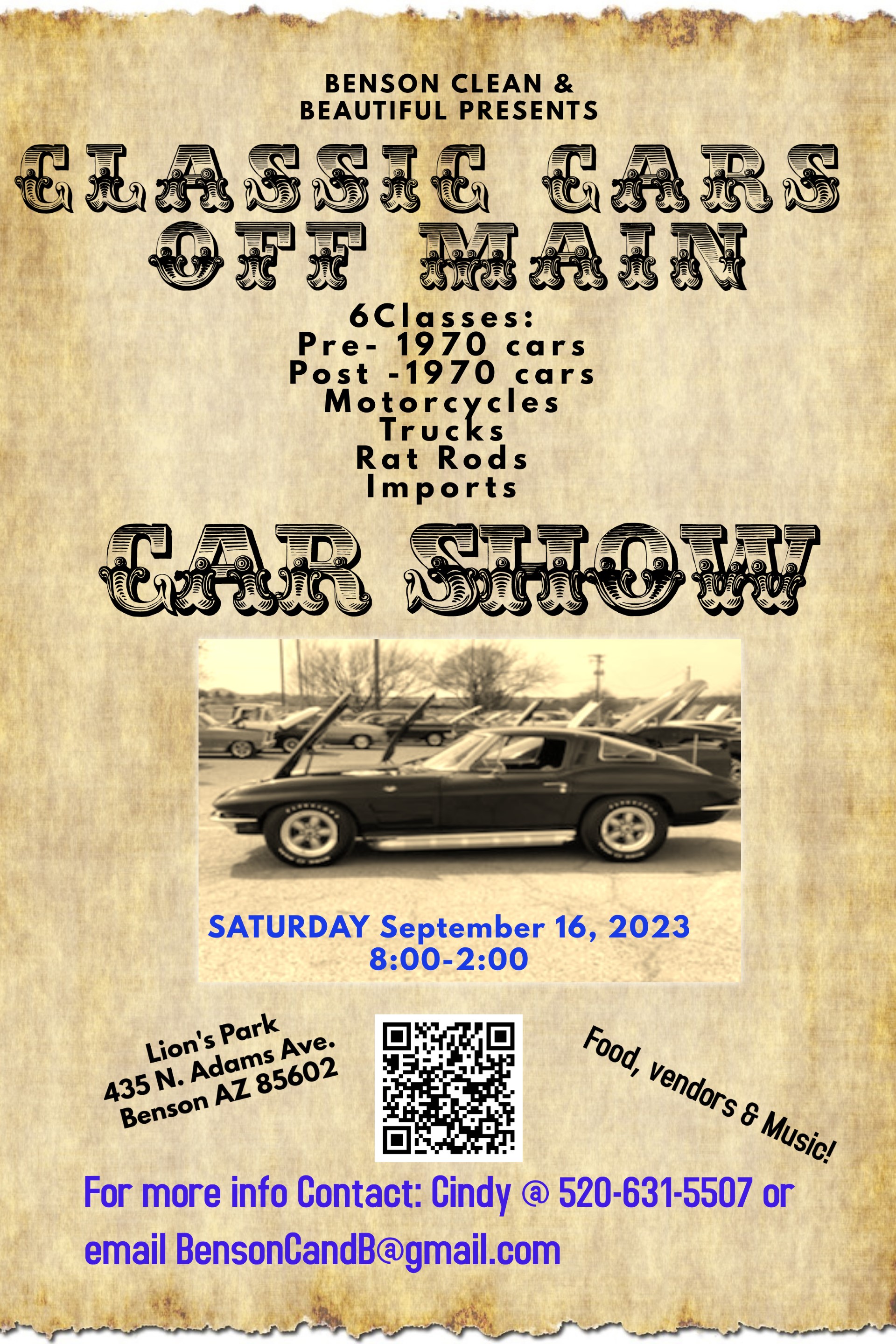 Benson Clean & Beautiful presents "Classic Cars Off Main" Car Show, Saturday, September 16, 2023 at Lion's Park, 435 N Adams Ave, Benson, AZ.